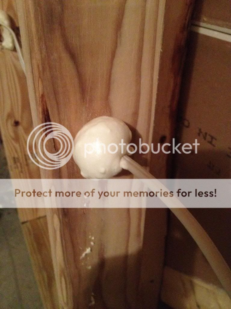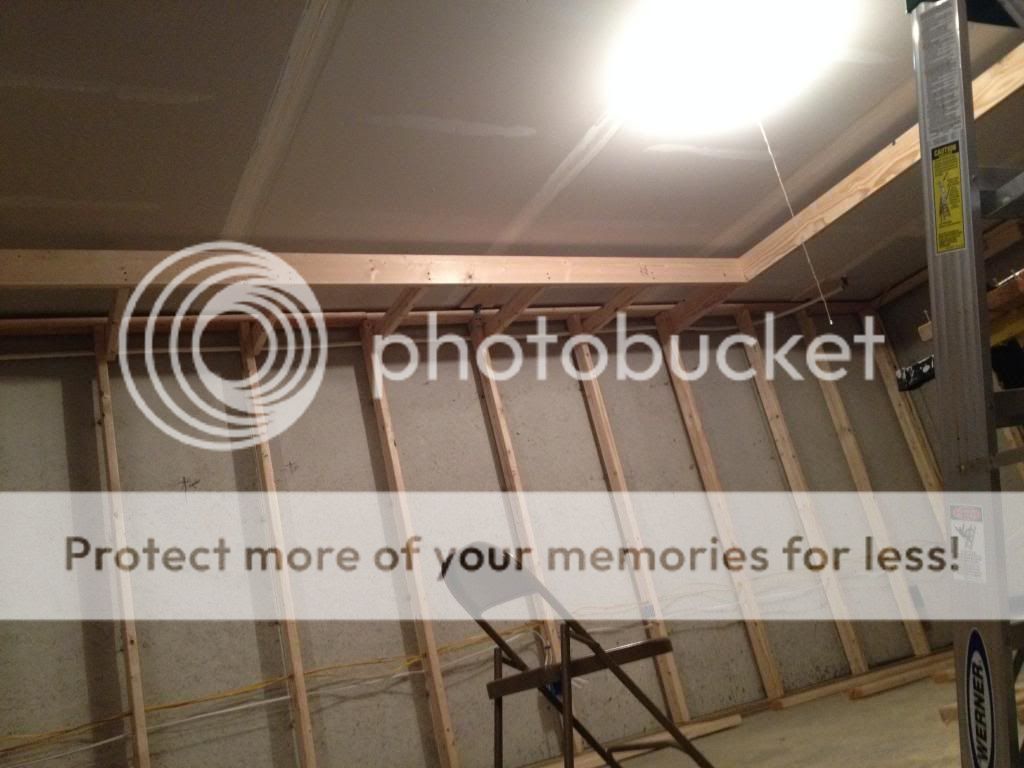 I'm using 2x4's spaced at 24" on center and will be using one layer of 5/8" drywall for the walls and soffits (more on this later). I'll be using a million and a half tubes of acoustic sealant anywhere I can. I built the wall parallel to the existing stairwell wall and held it off by 1". And also built the return wall which creates the storage space behind the back of the HT. I'll be picking away at the other two walls over the course of this week. I plan on holding the walls along the concrete foundation walls by at least 2" to allow for the water inlet pipe run back to the storage room. I'll be wrapping the new pipe in insulation so that it doesn't create noise within the wall.